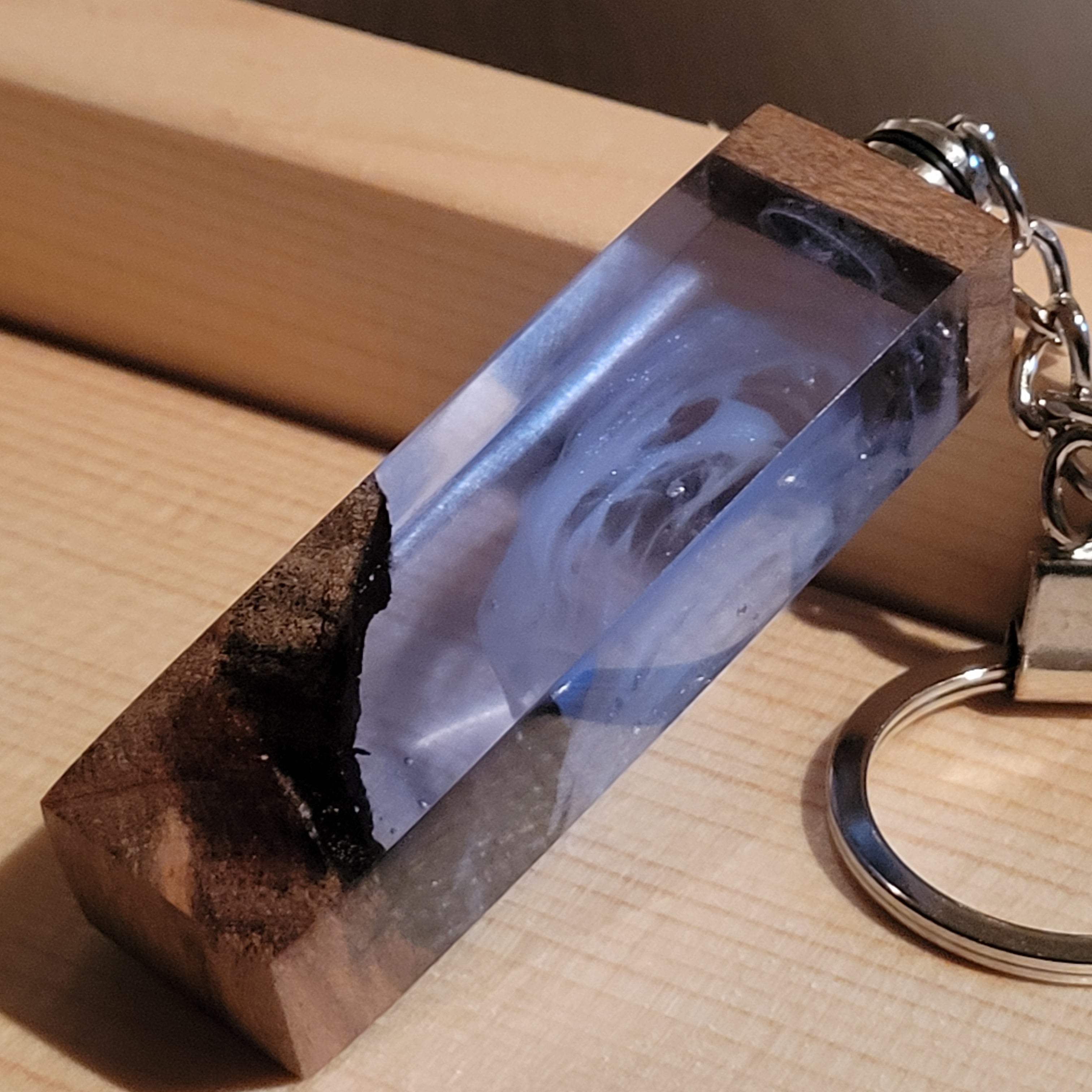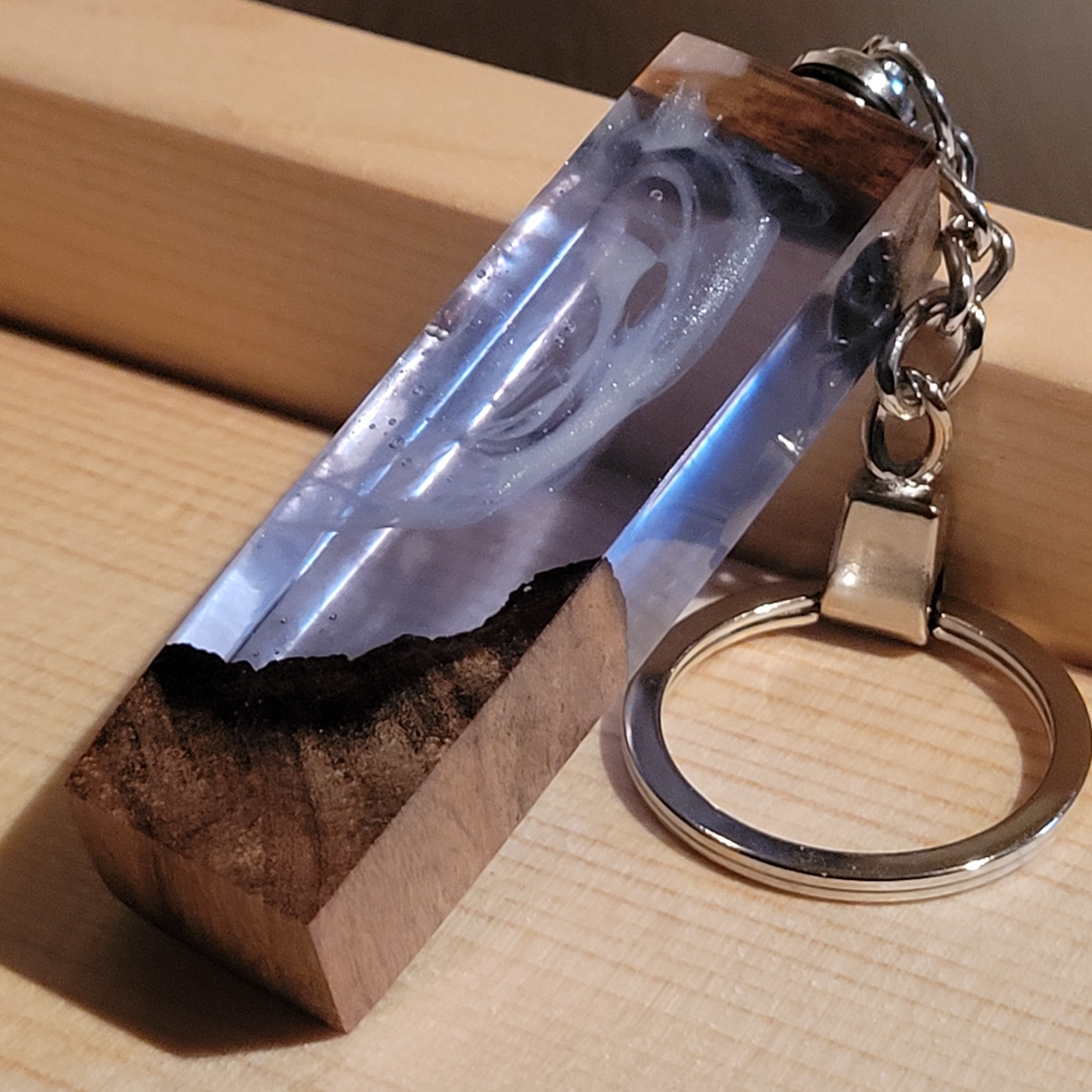光を宿すオリーブウッド。幻想空間を持ち歩く LEDウッドレジンキーホルダー シアン №1