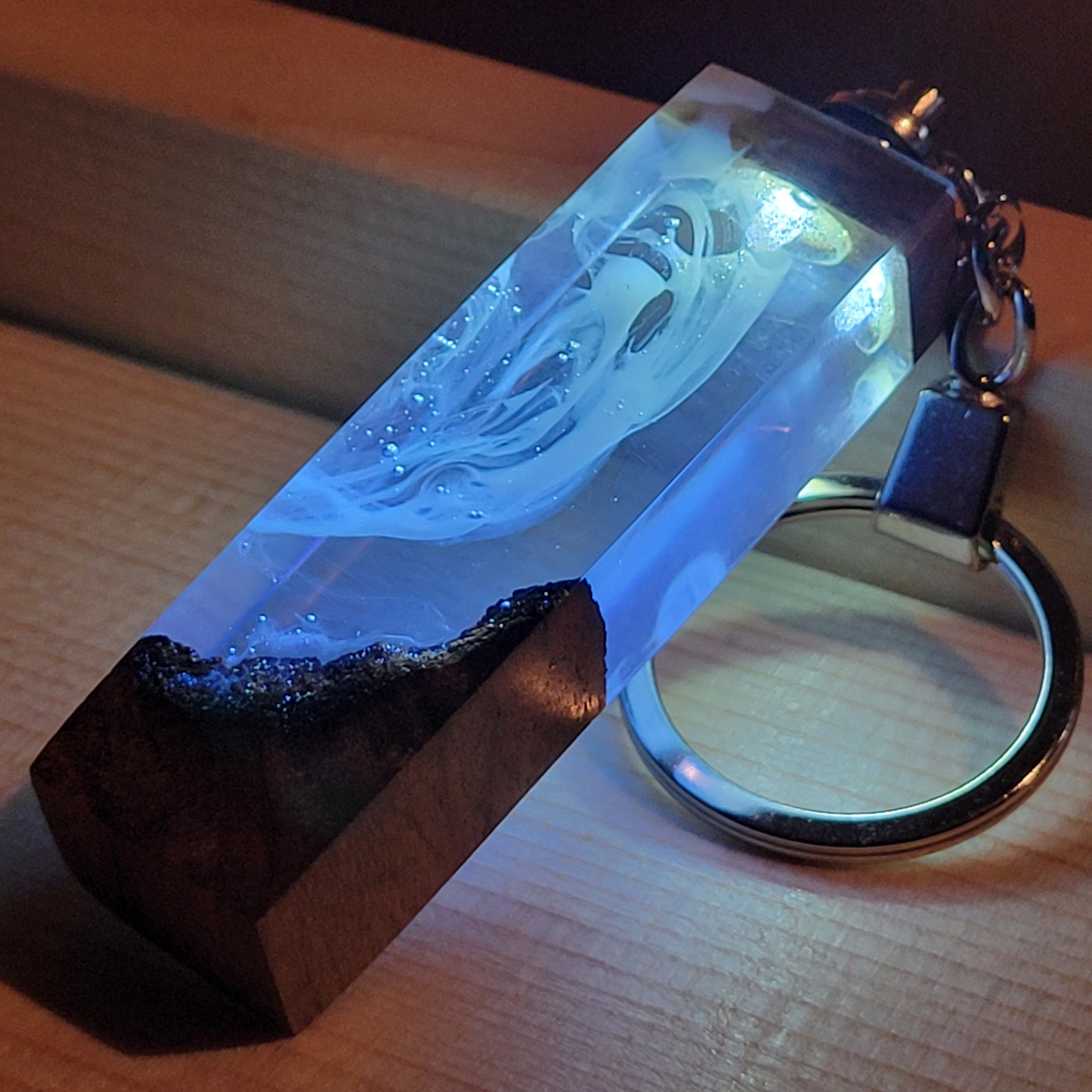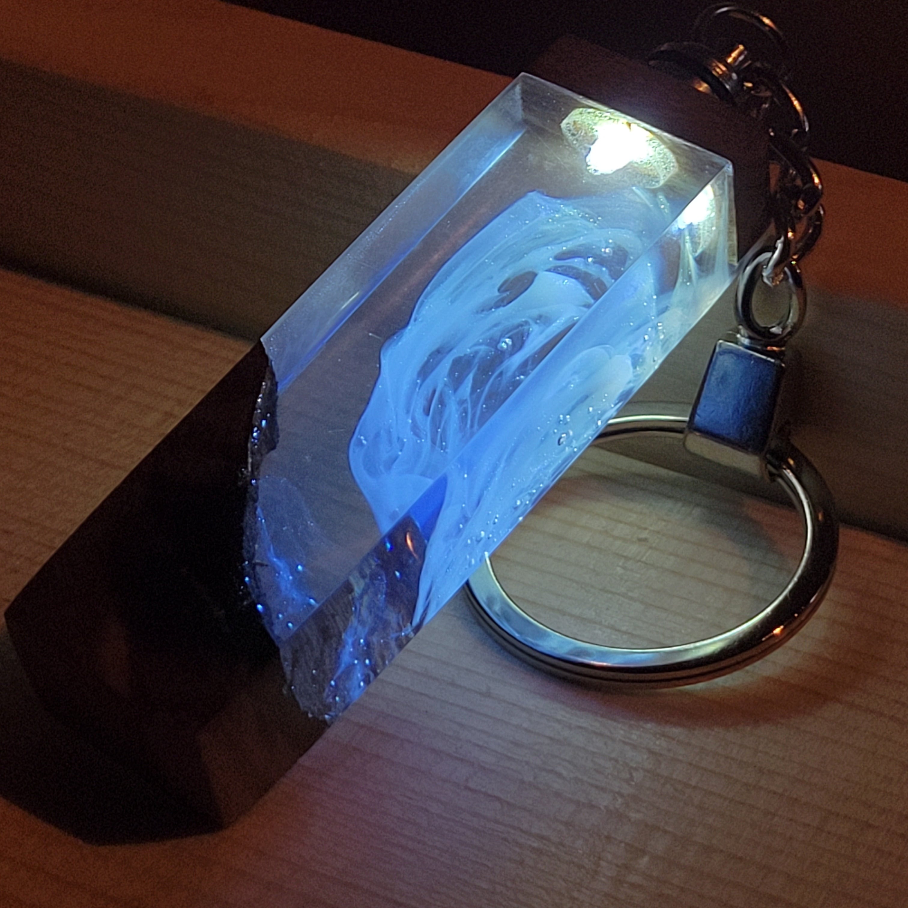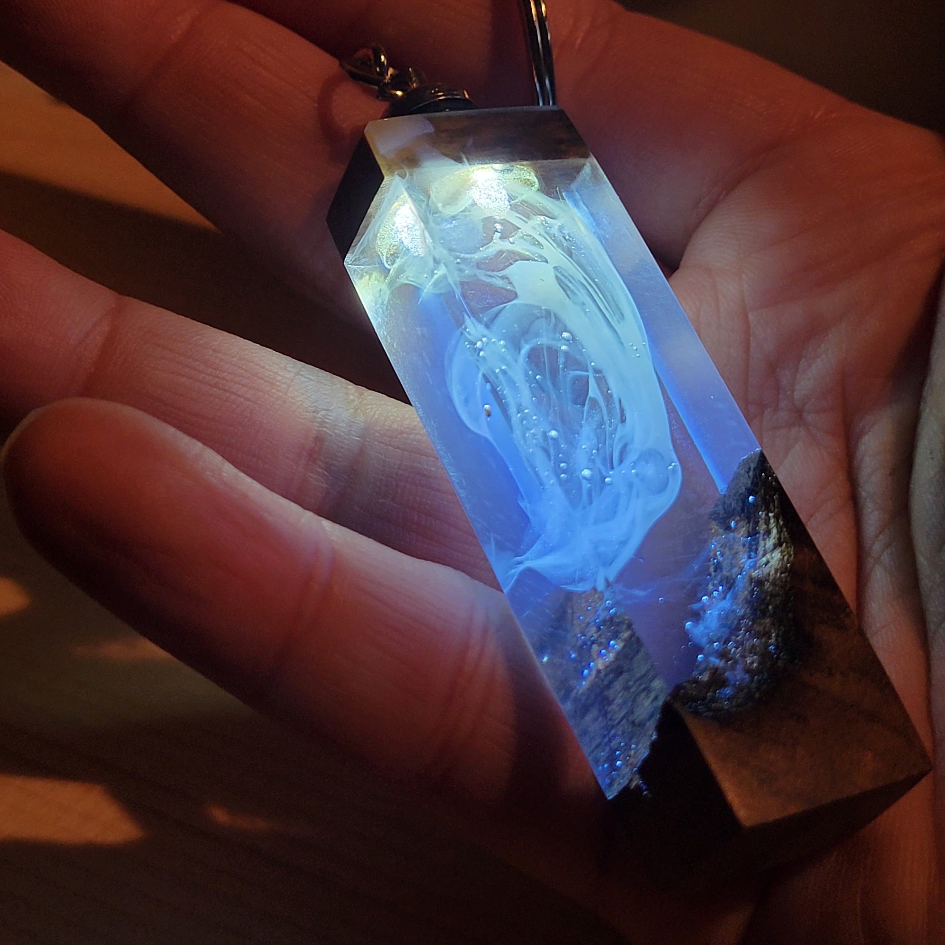 スイッチを入れた瞬間、レジンの中に閉じ込められたスモーク状のアートが光を乱反射し、暗闇にフワッと浮かび上がります。
