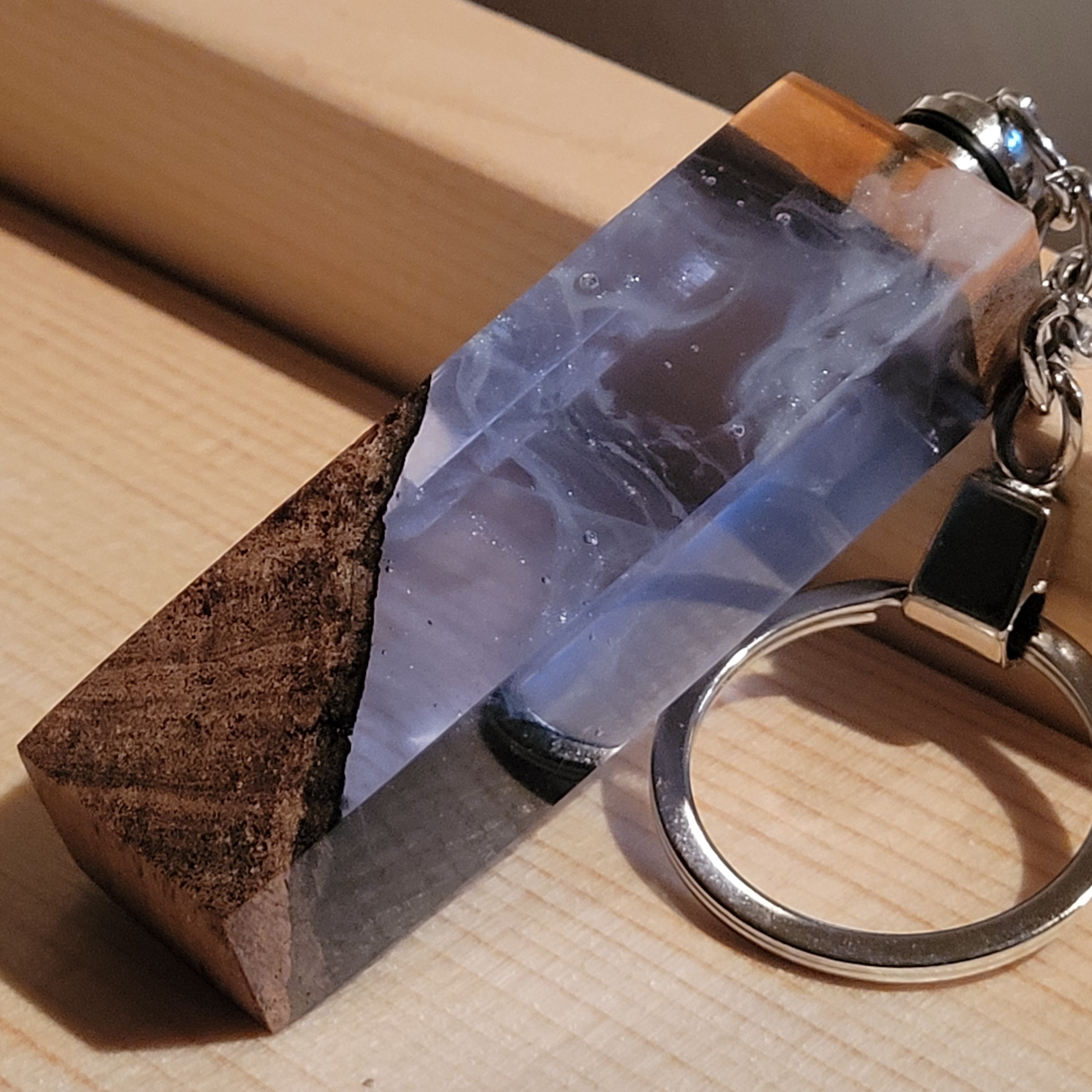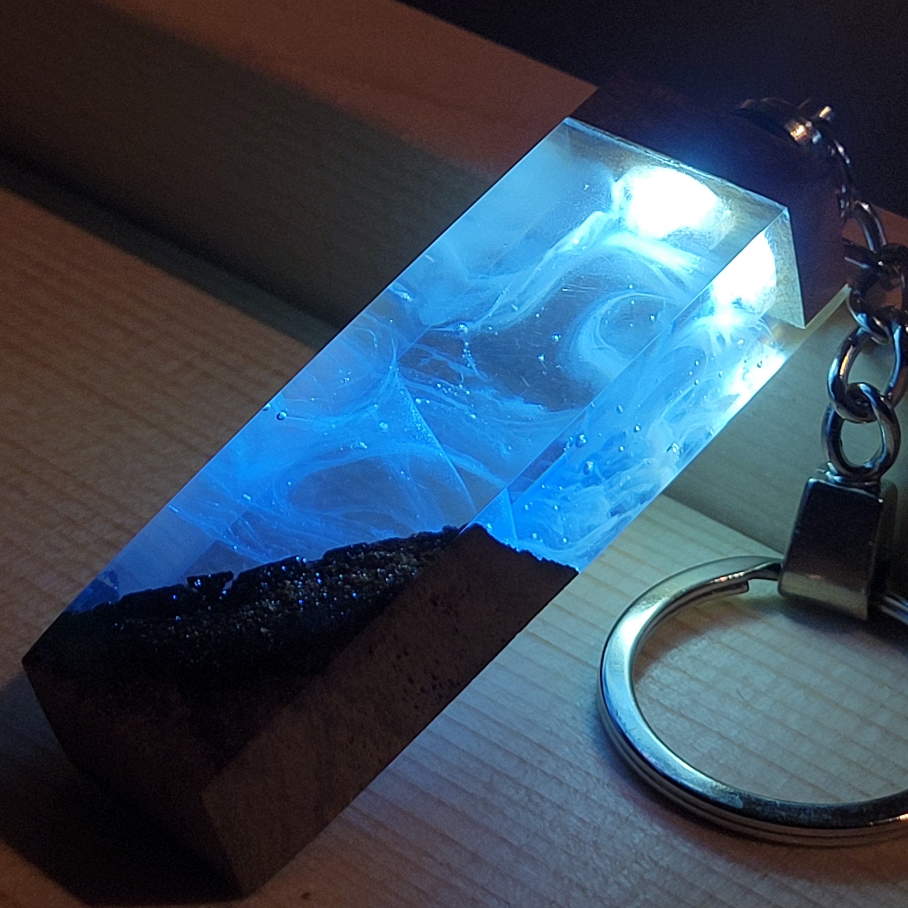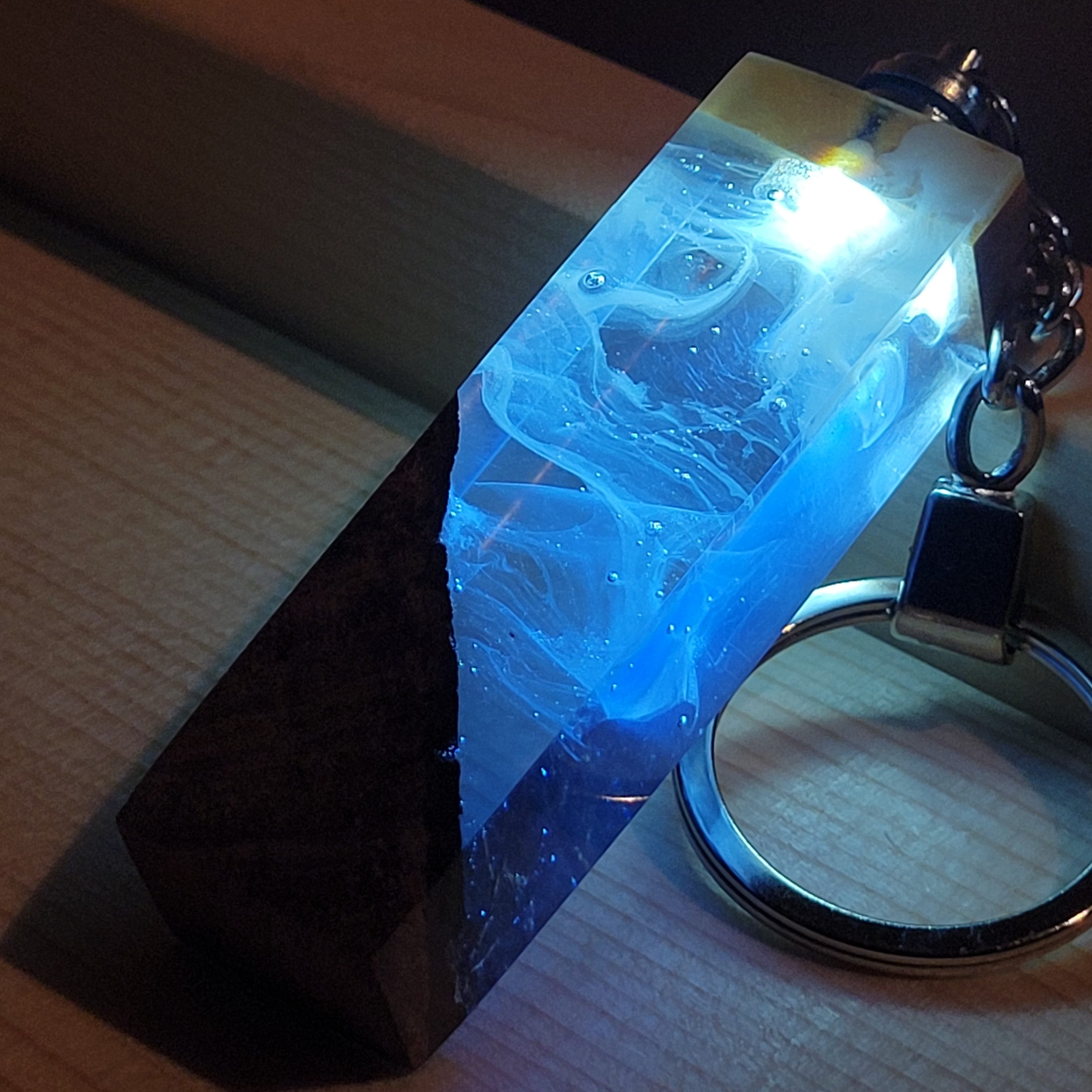 光を宿すオリーブウッド。幻想空間を持ち歩く LEDウッドレジンキーホルダー シアン №2