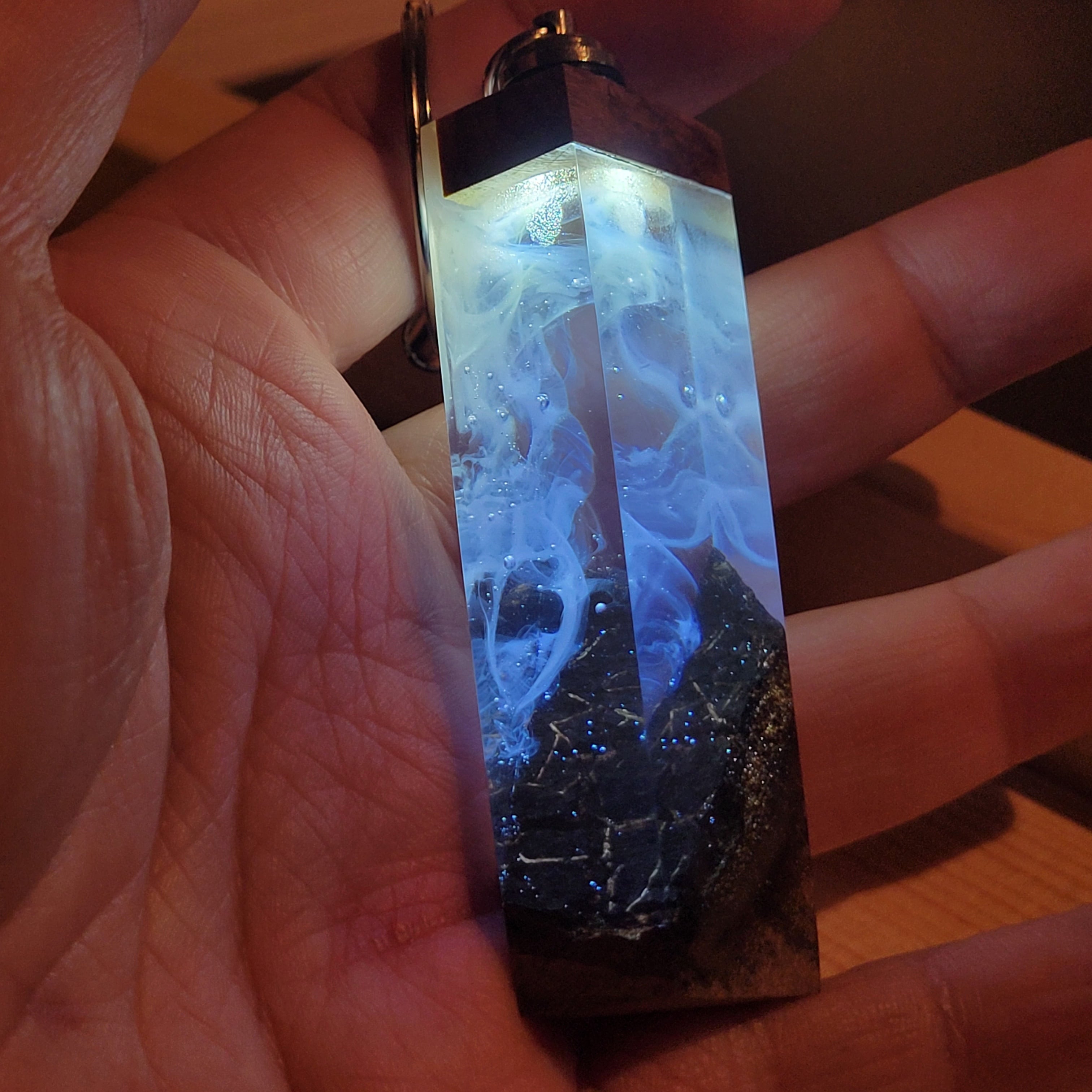 スイッチを入れた瞬間、レジンの中に閉じ込められたスモーク状のアートが光を乱反射し、暗闇にフワッと浮かび上がります。
