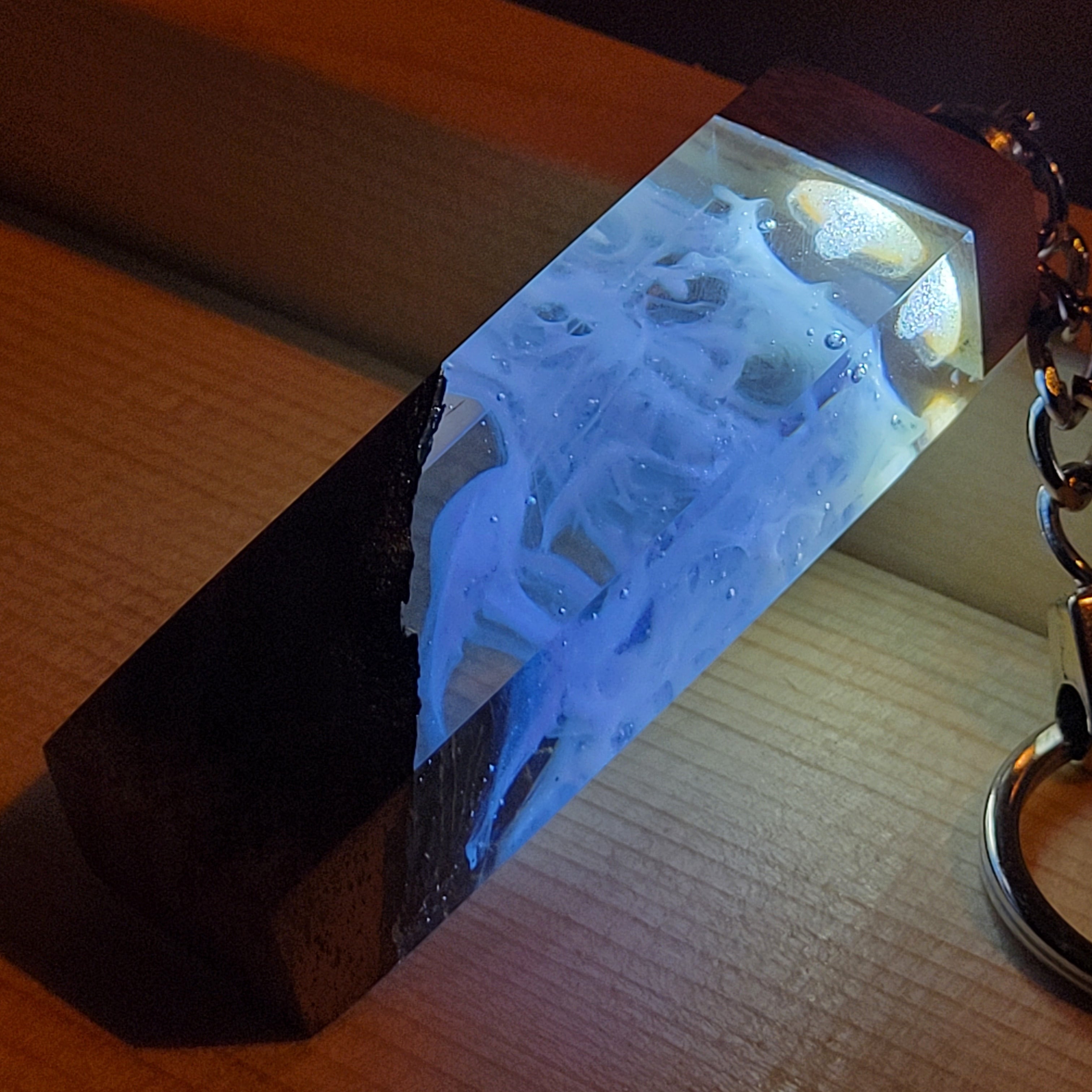 スイッチを入れた瞬間、レジンの中に閉じ込められたスモーク状のアートが光を乱反射し、暗闇にフワッと浮かび上がります。