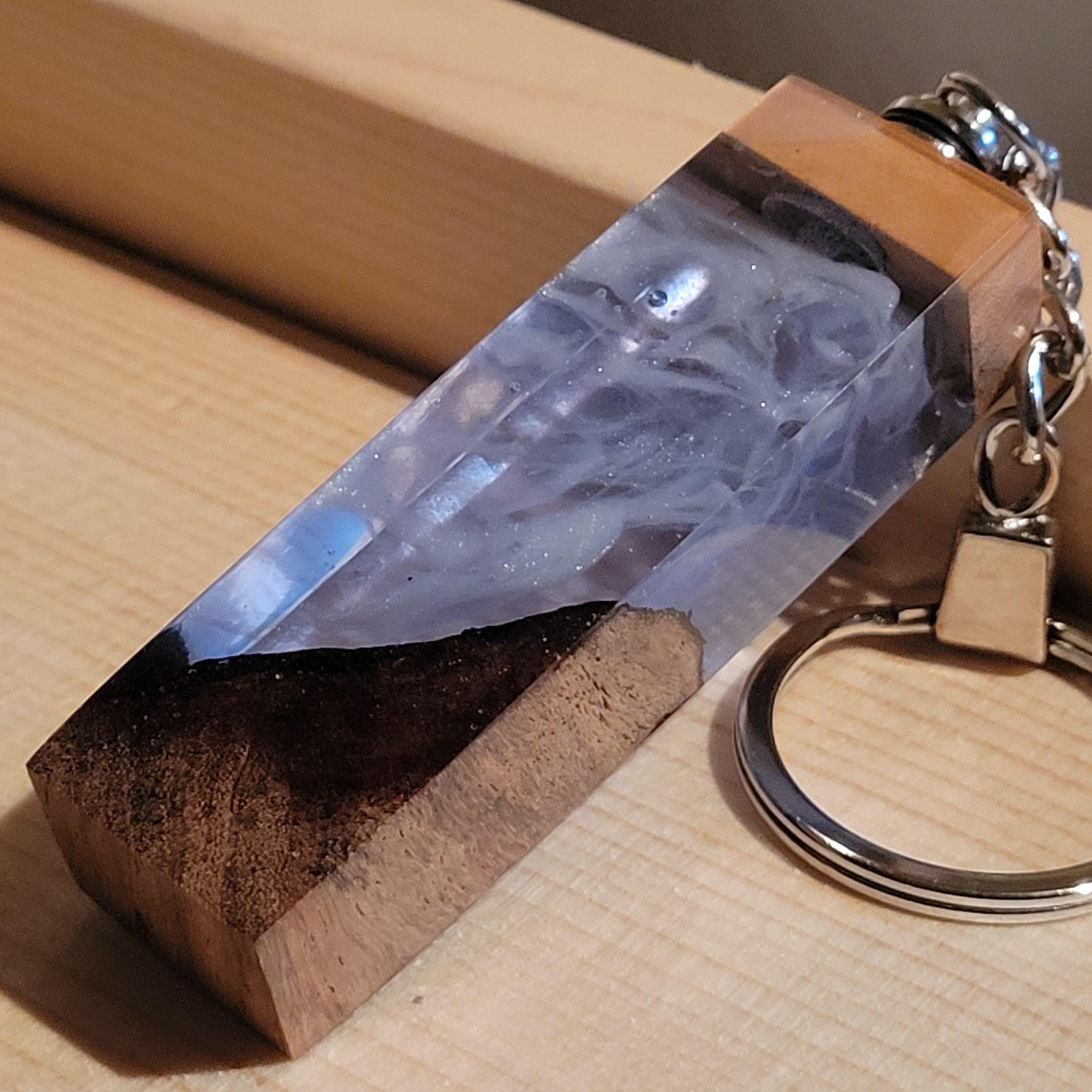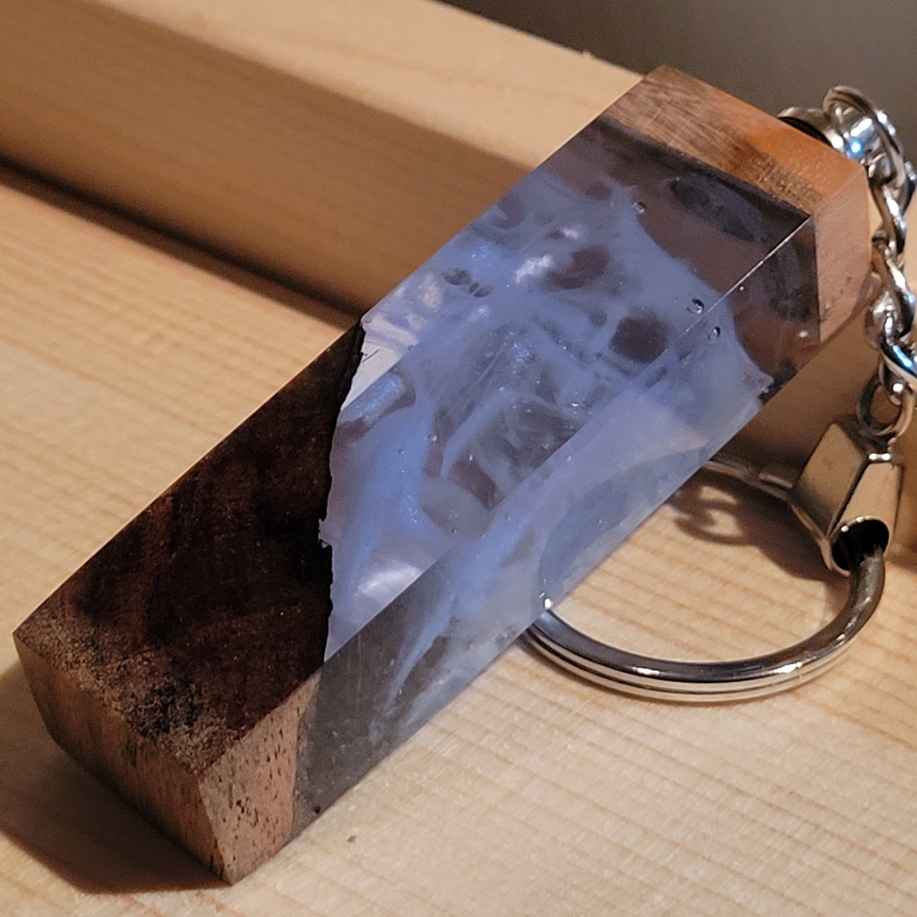光を宿すオリーブウッド。幻想空間を持ち歩く LEDウッドレジンキーホルダー シアン №3