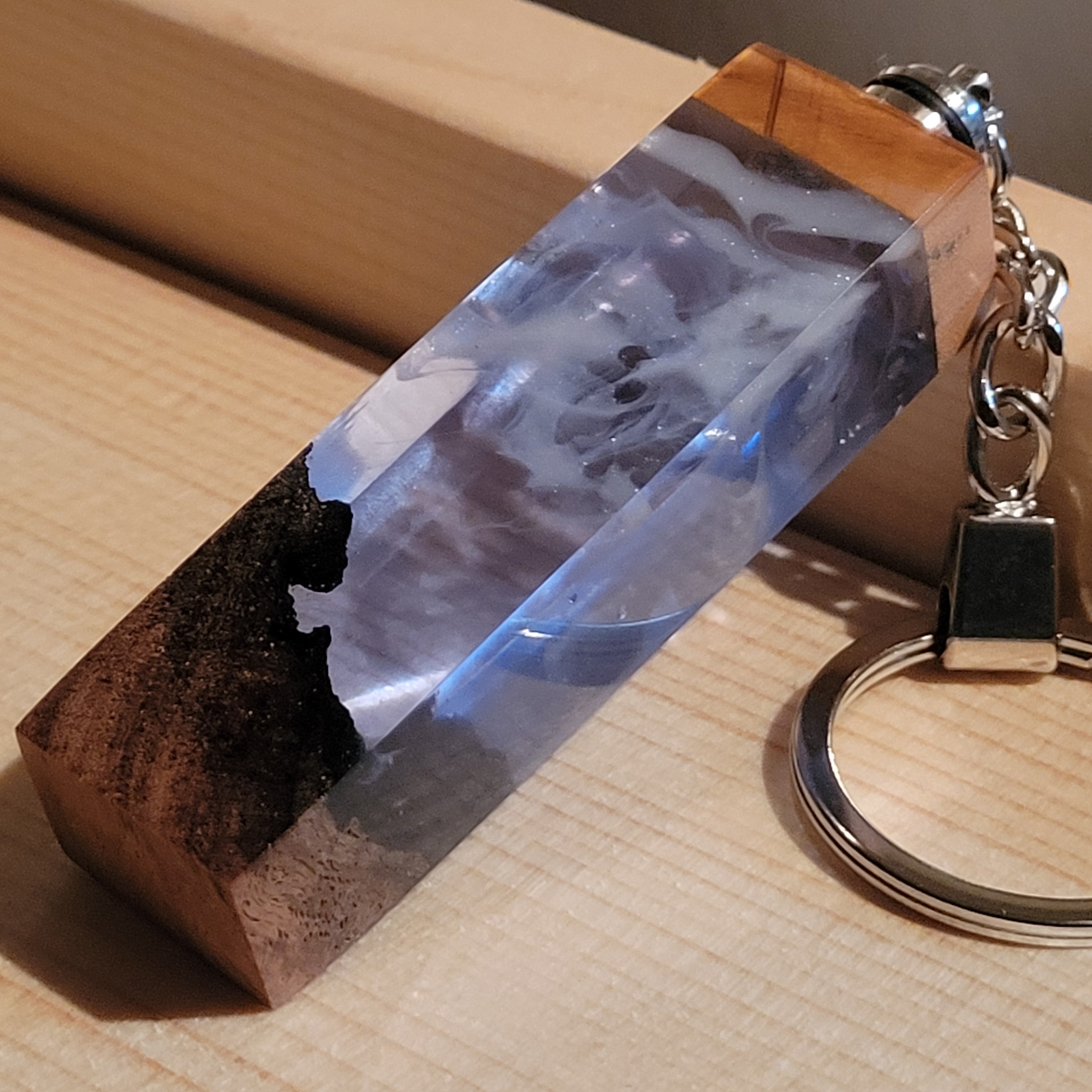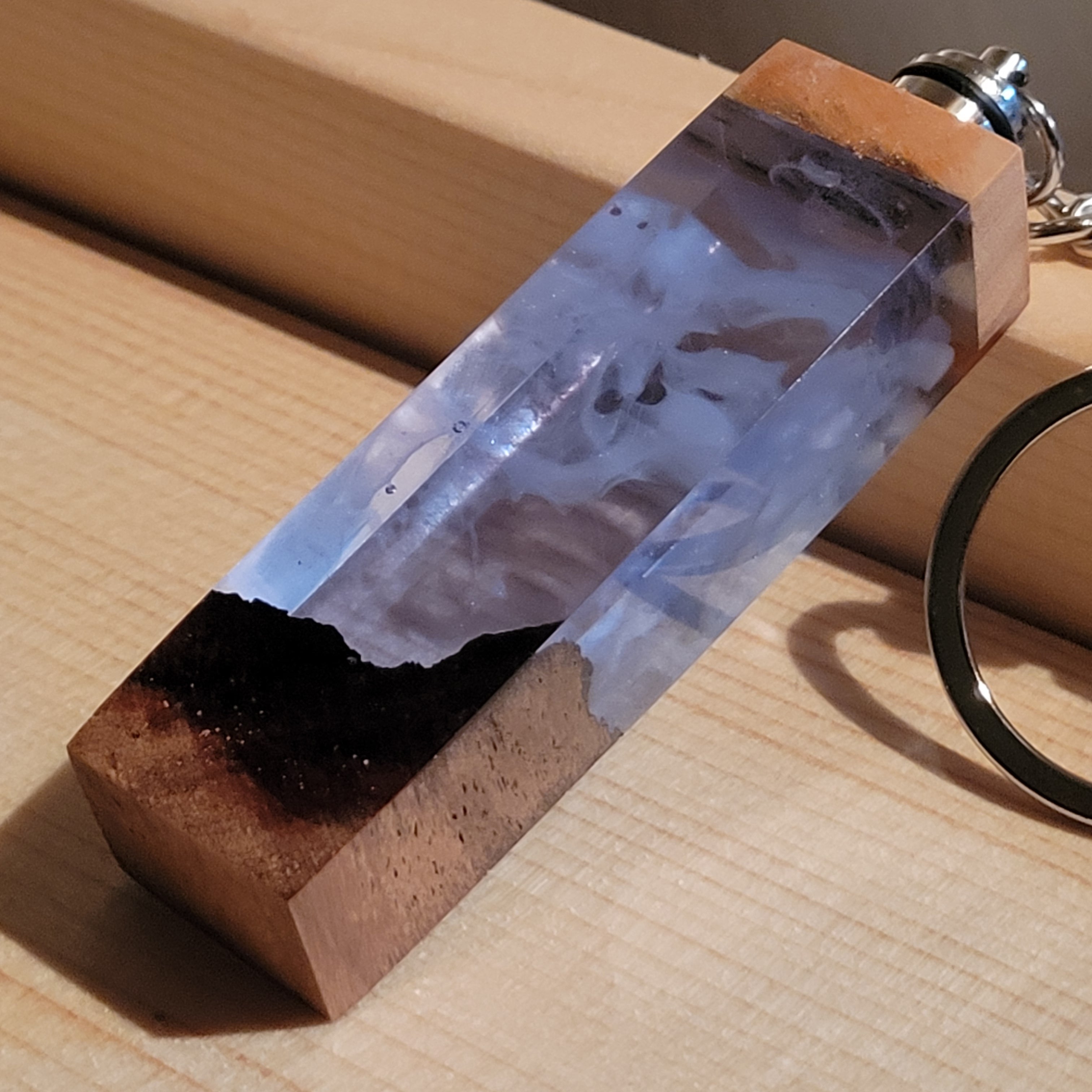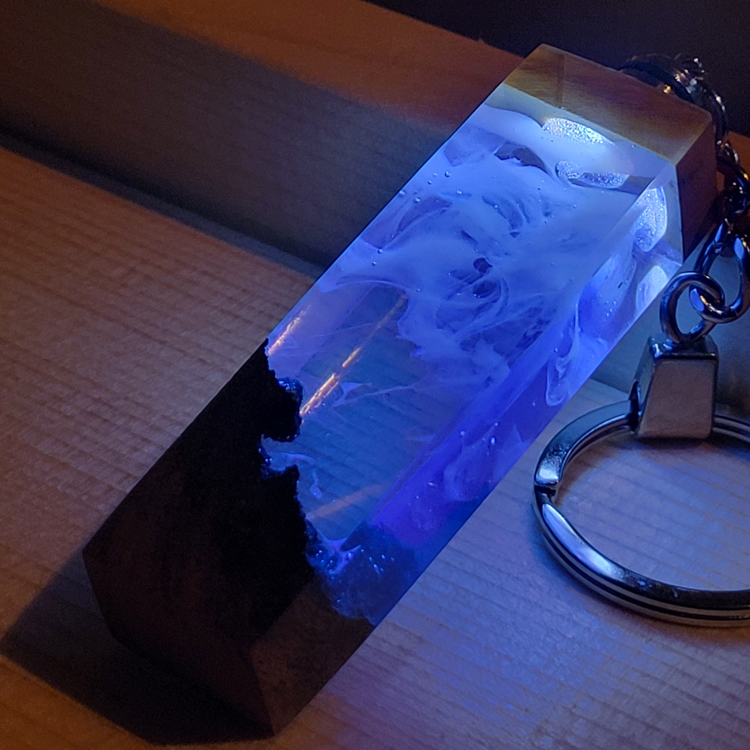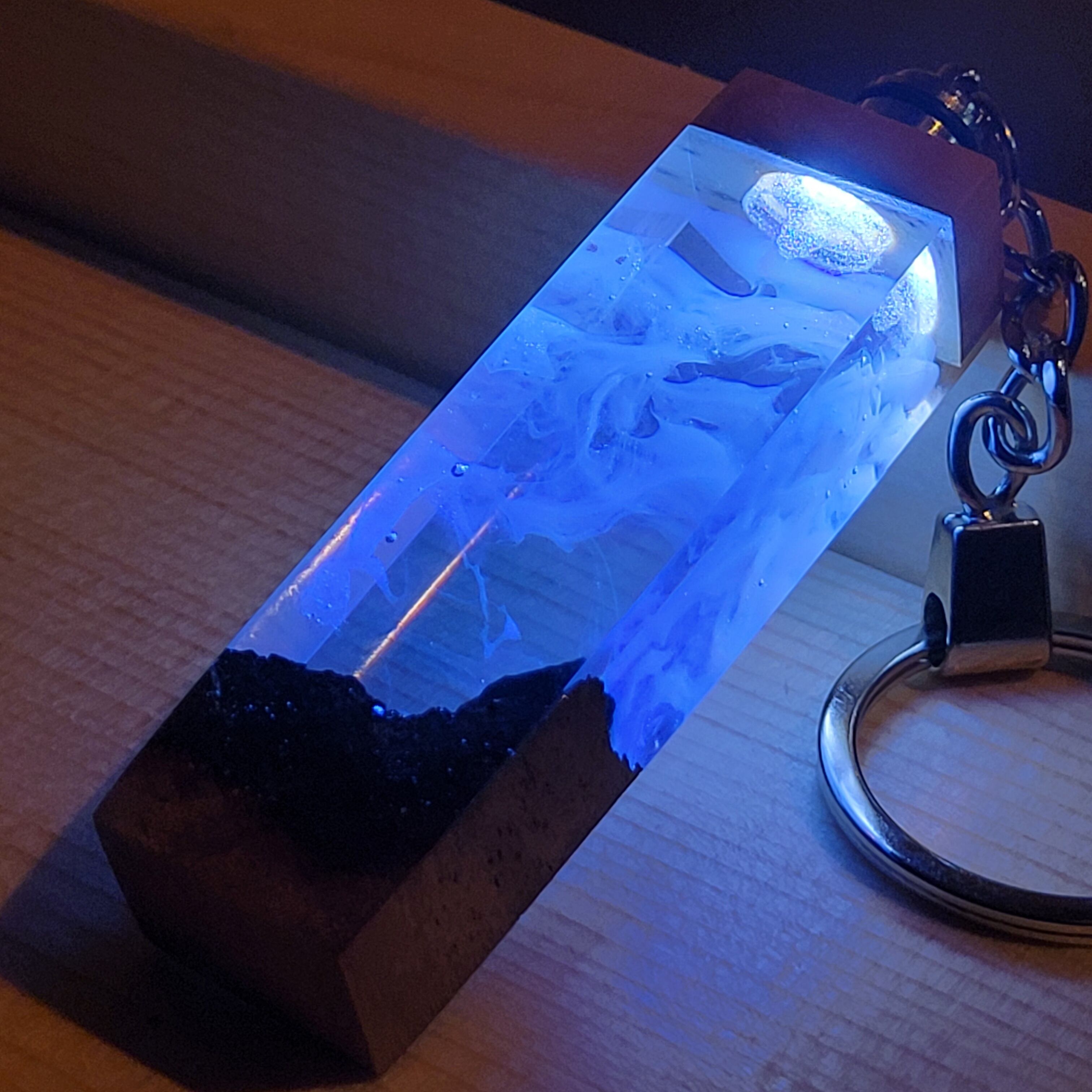 光を宿すオリーブウッド。幻想空間を持ち歩く LEDウッドレジンキーホルダー シアン №5