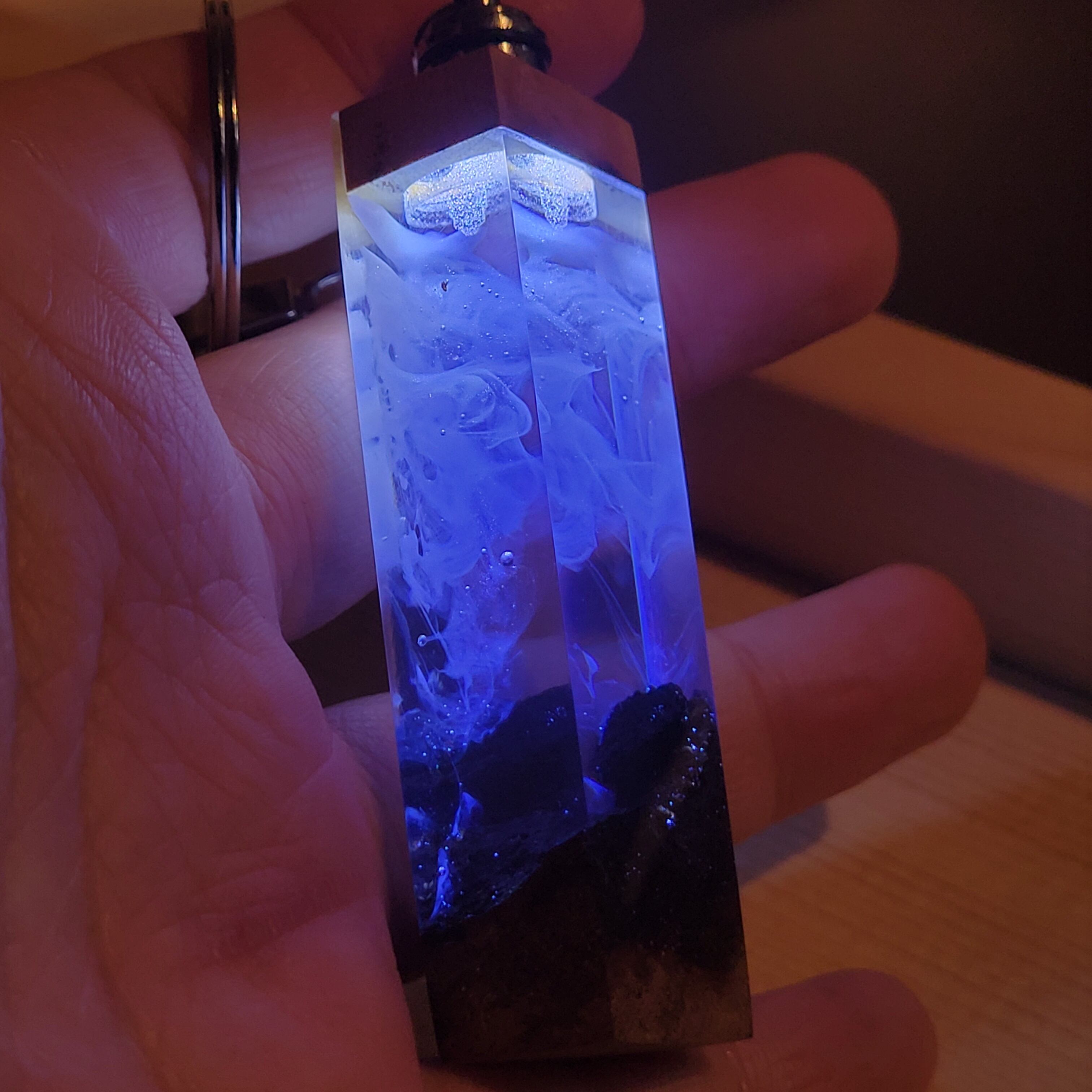 スイッチを入れた瞬間、レジンの中に閉じ込められたスモーク状のアートが光を乱反射し、暗闇にフワッと浮かび上がります。