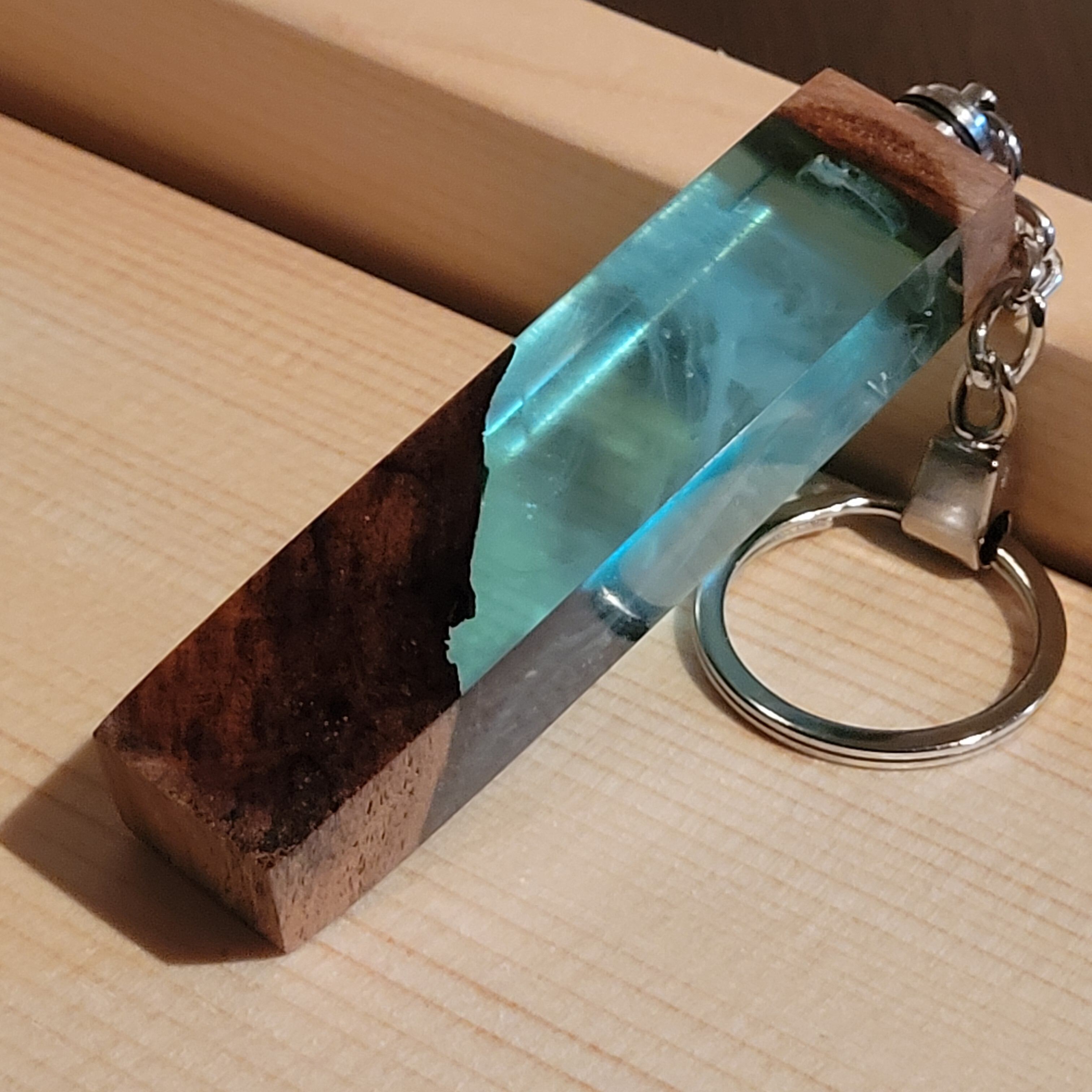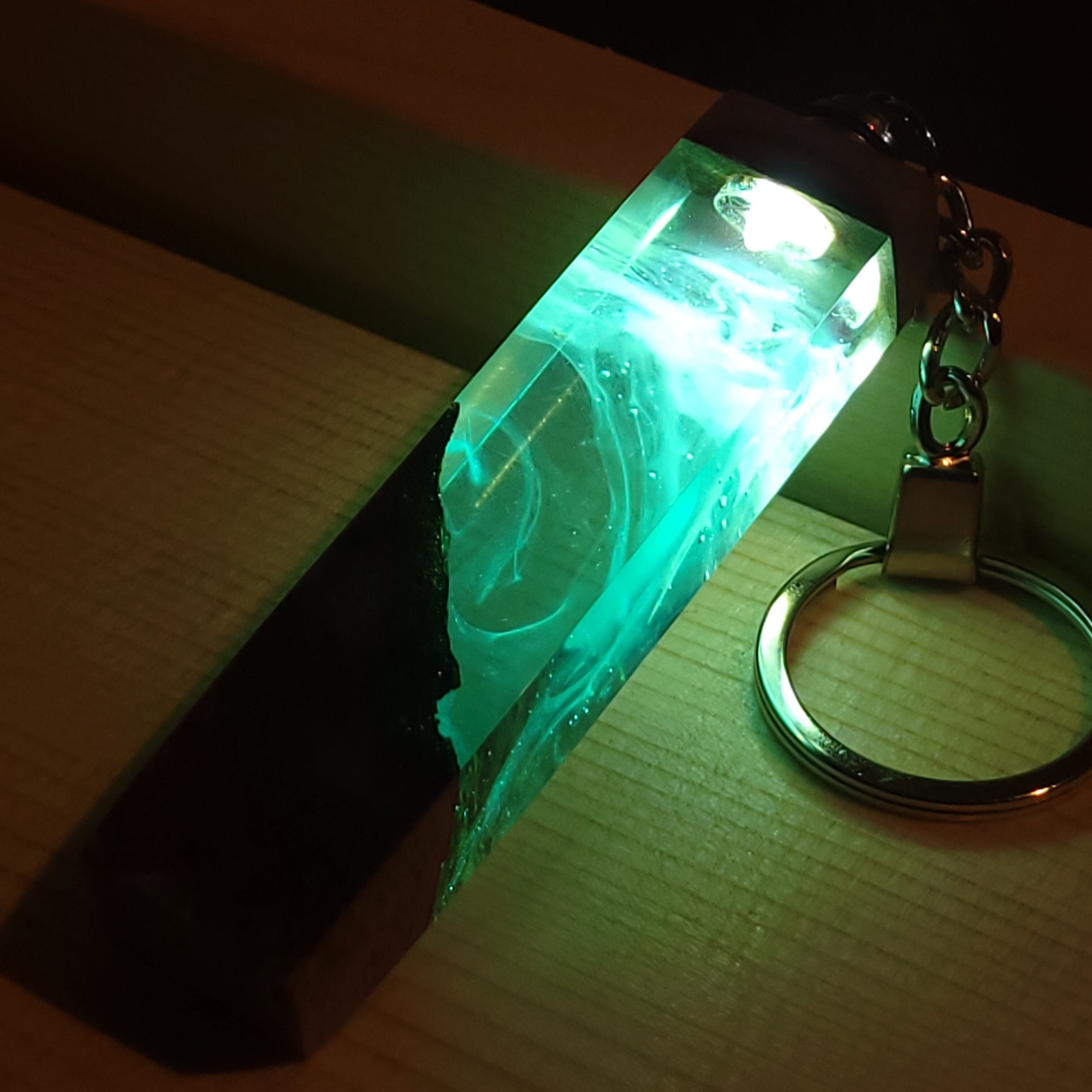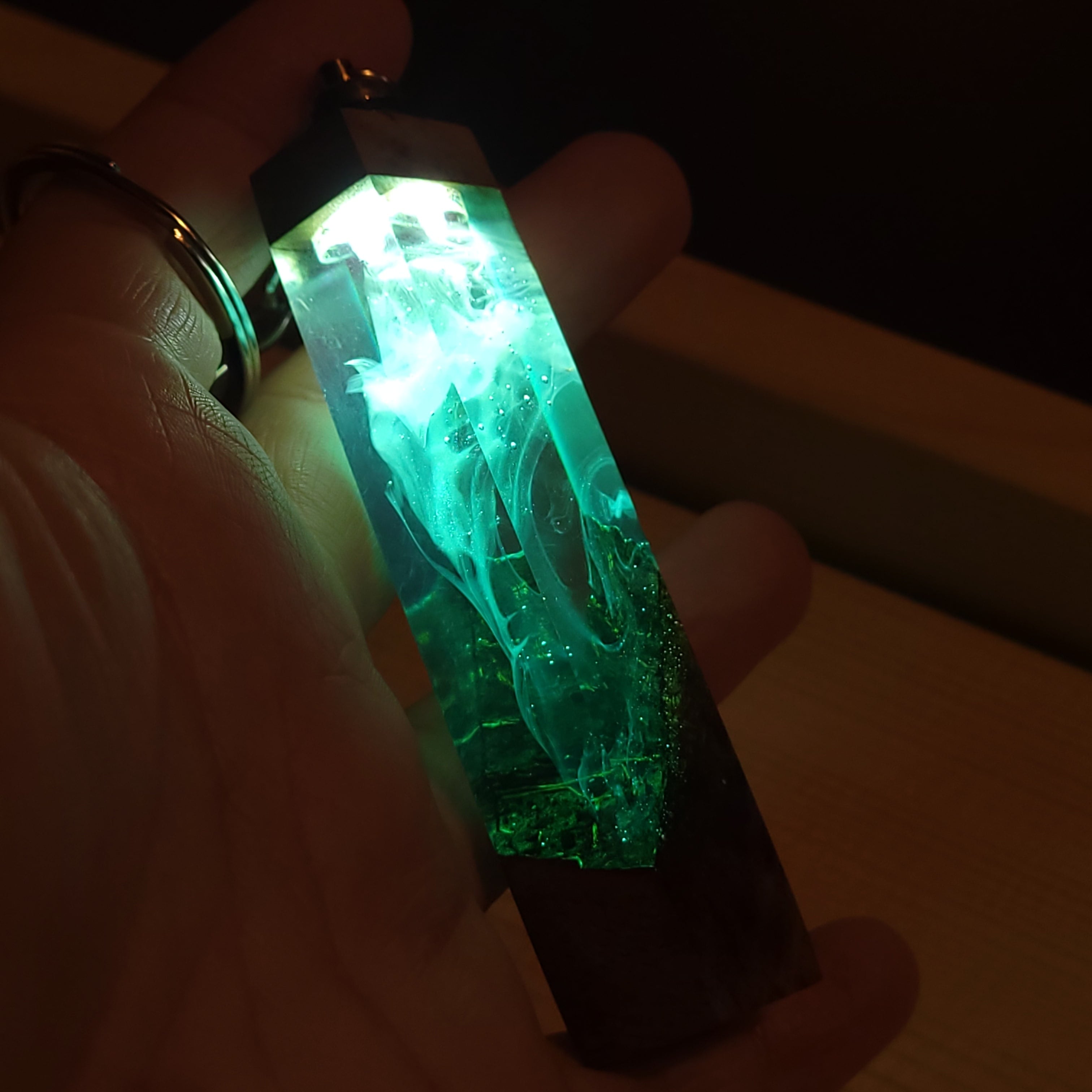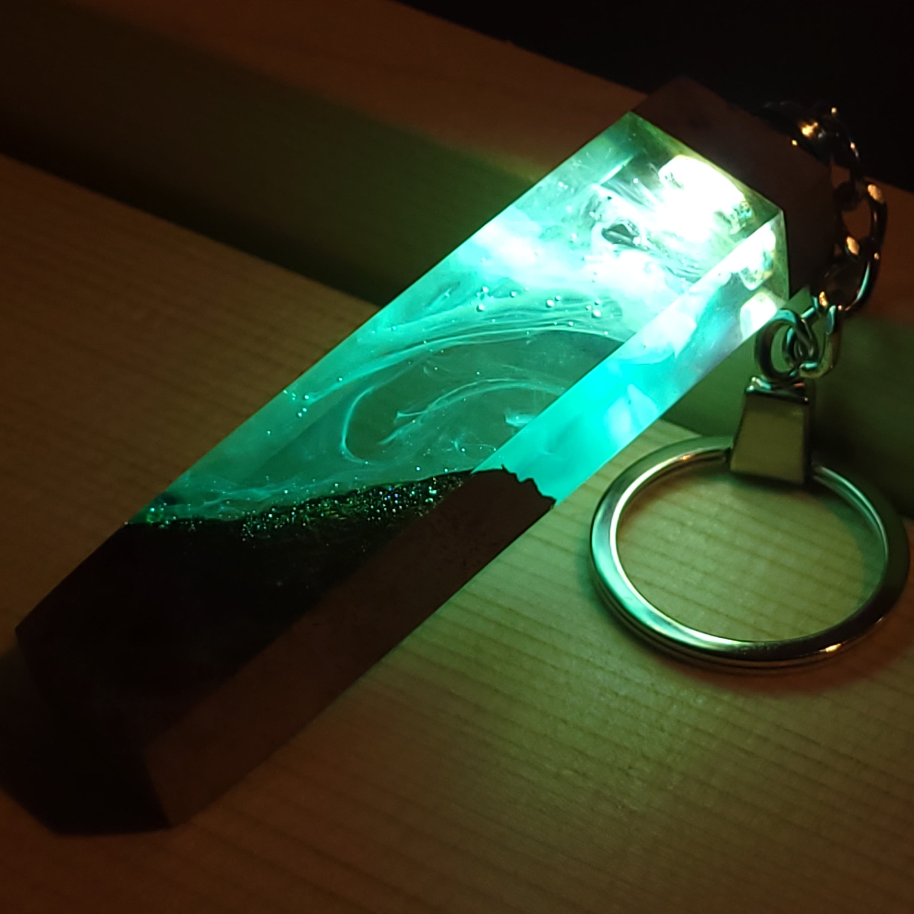 光を宿すオリーブウッド。幻想空間を持ち歩く LEDウッドレジンキーホルダー ターコイズ №2
